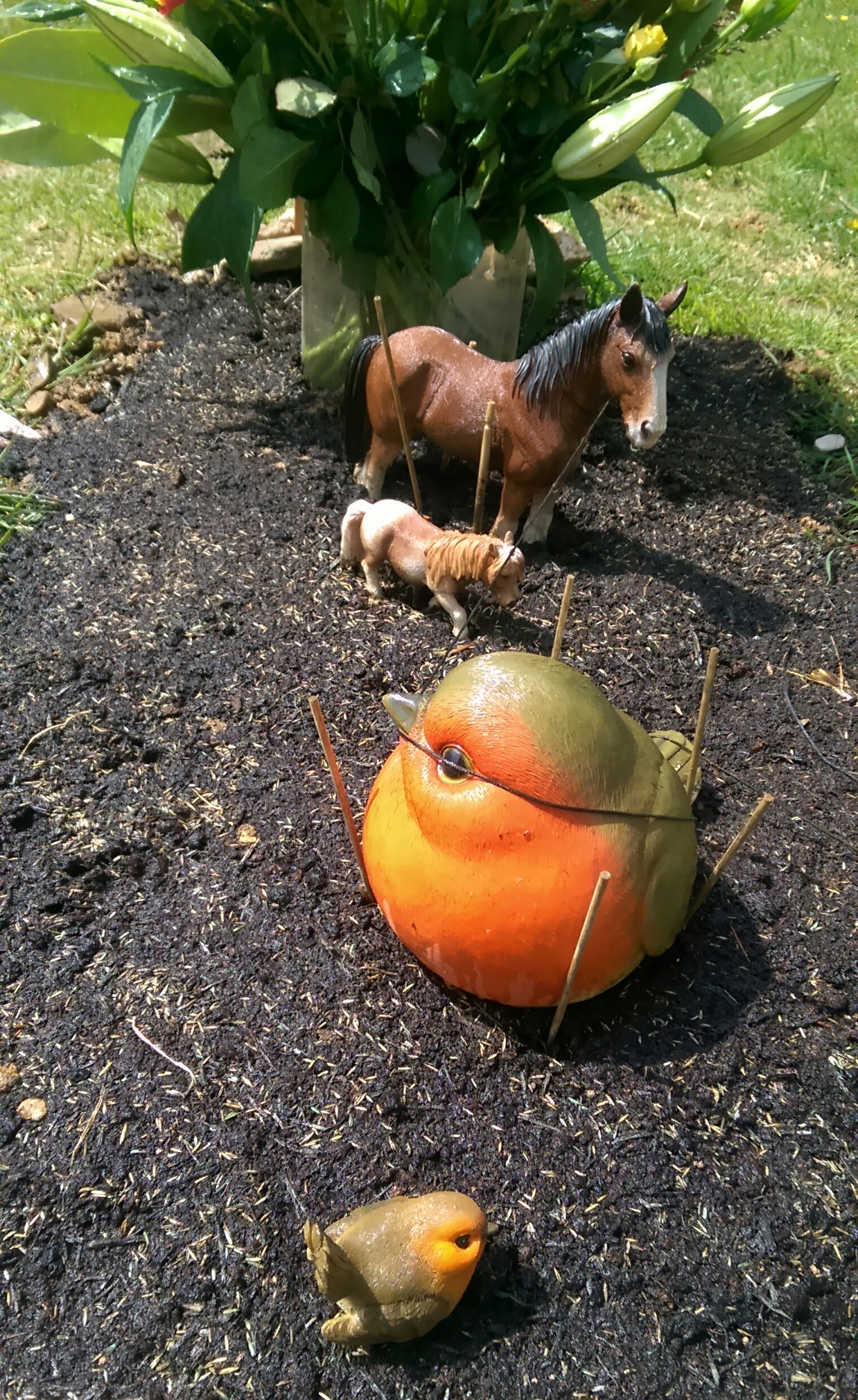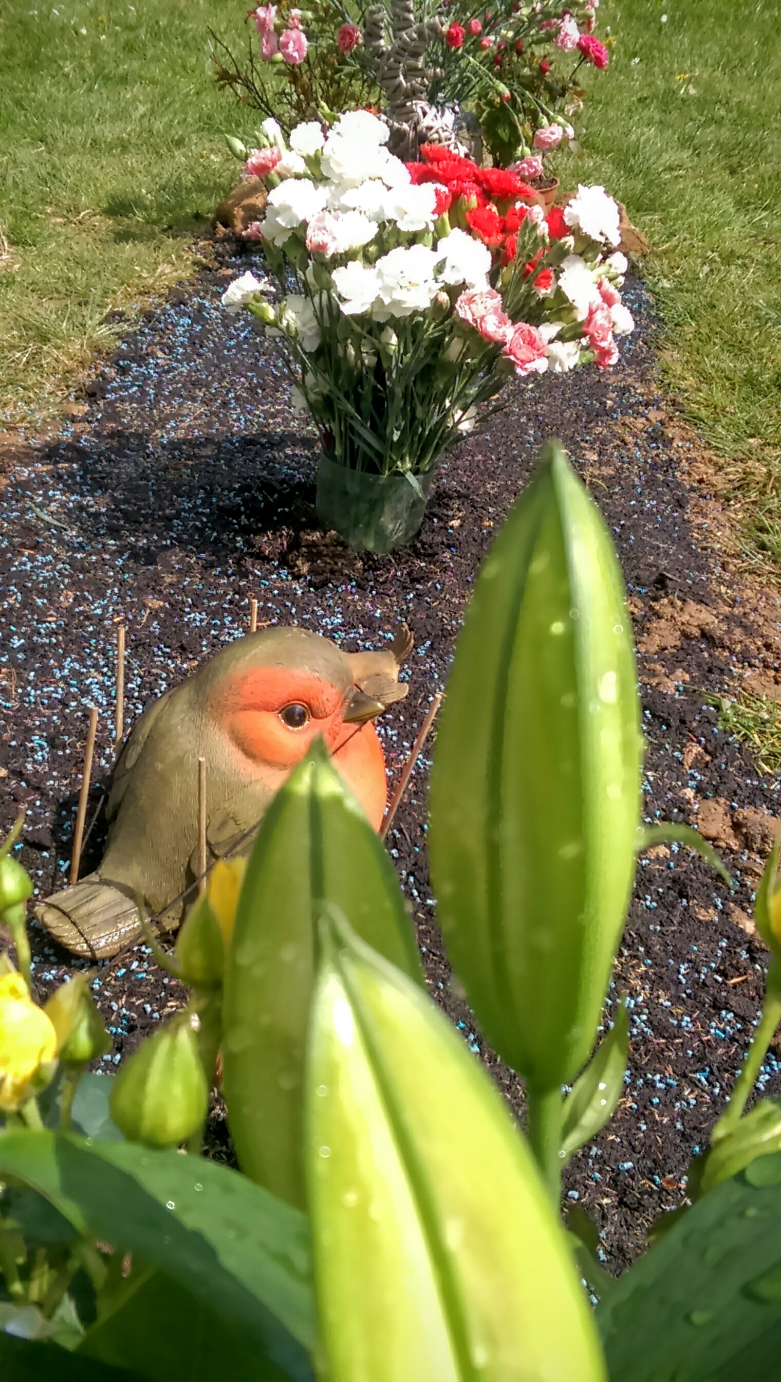 Having removed bucketloads of stones, we levelled out, spread new compost, sprinkled grass seed and watered thoroughly. Only then did we replace the flowers and other ornaments, and I must admit, it certainly looked much more fitting. I hope you think so too.