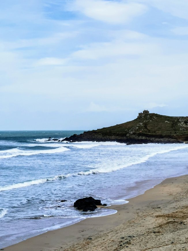 On the rocks, surrounded by water