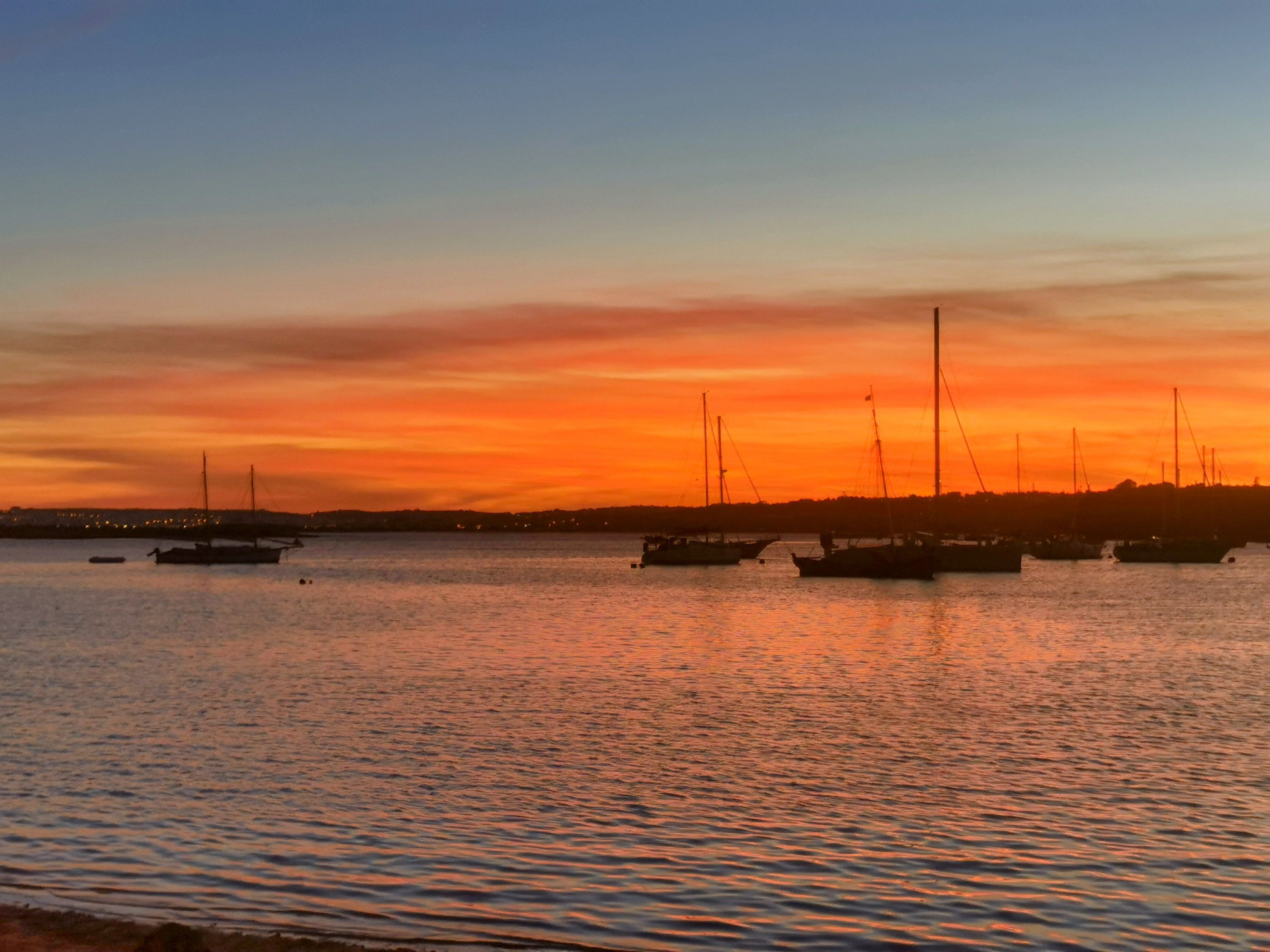 The sun slowly sets behind the shore