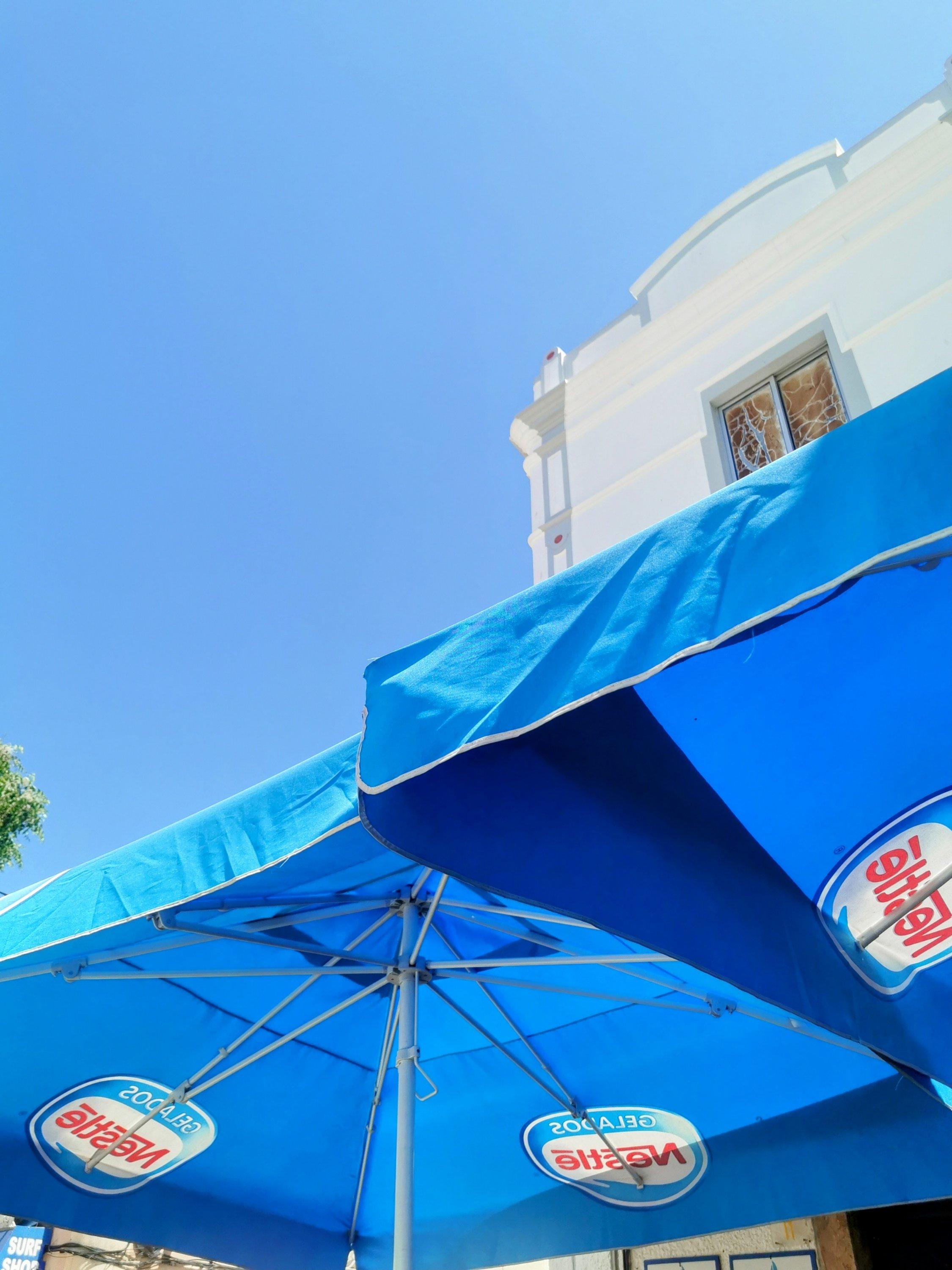 Beneath an umbrella, shaded from the sky