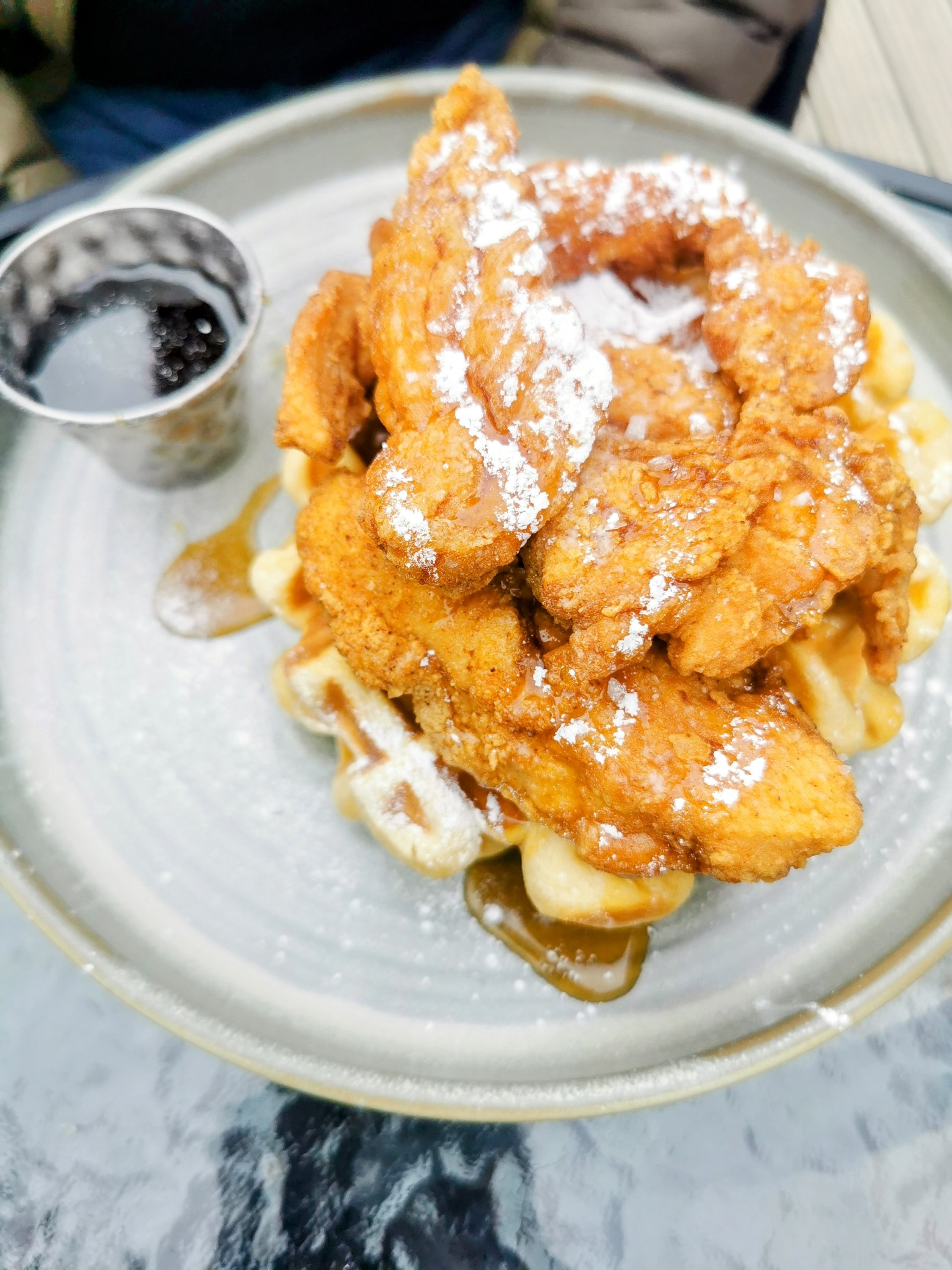 Two waffles, drenched crispy chicken, maple syrup, pearl sugar and sea salt