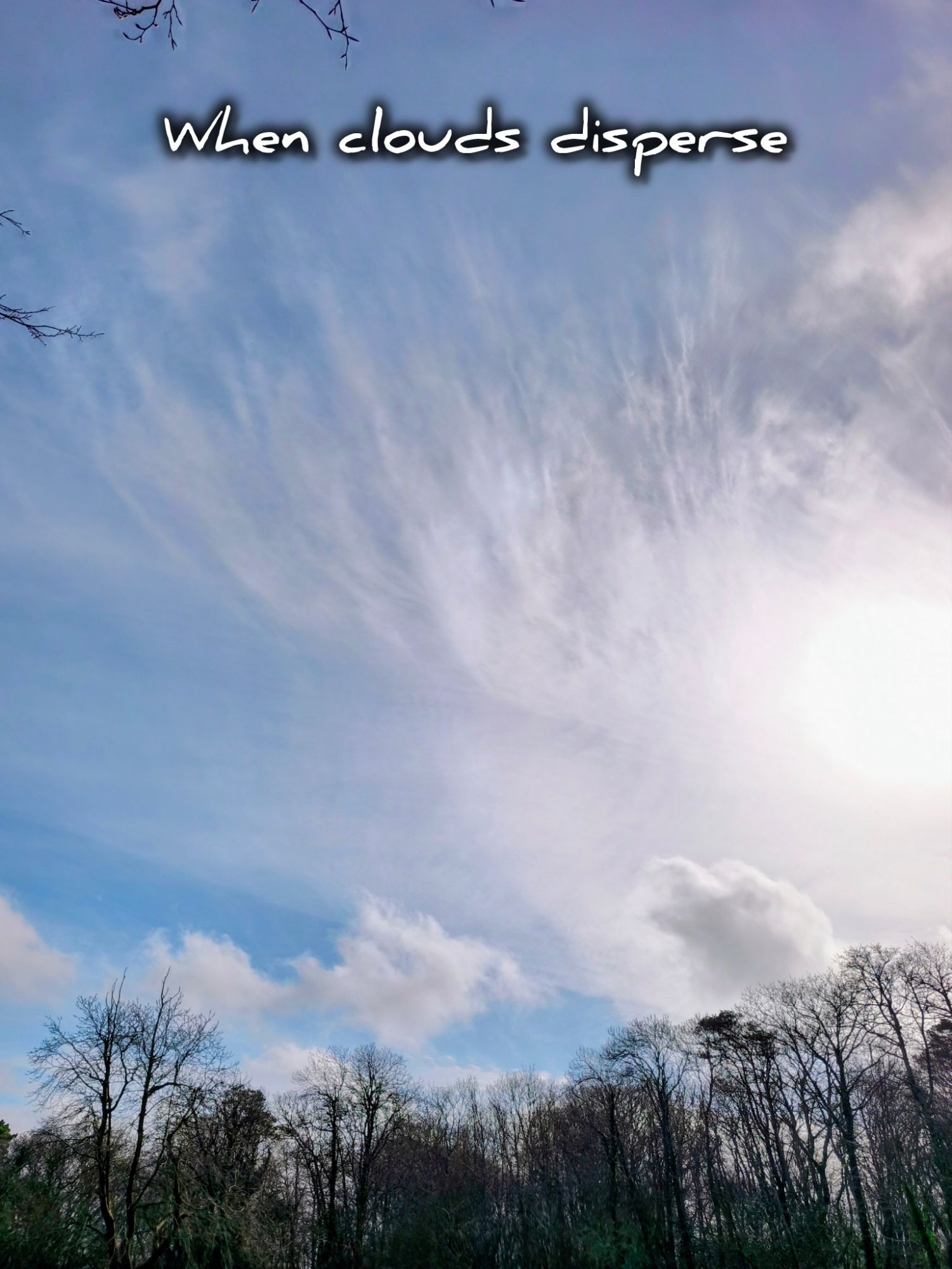 Feb22 When clouds disperse Posted on February 22, 2026 by MeRaw Standard Sunday 22nd February When clouds disperse And lift the grey Darkened corners Lighten up the day A sudden warmth Awakens things And joy within The spirit sings Love you so much Precious sons Treasured Mum xxxxx Rate this:Share this: Share on X (Opens in new window) X Share on Facebook (Opens in new window) Facebook Like Loading... Related